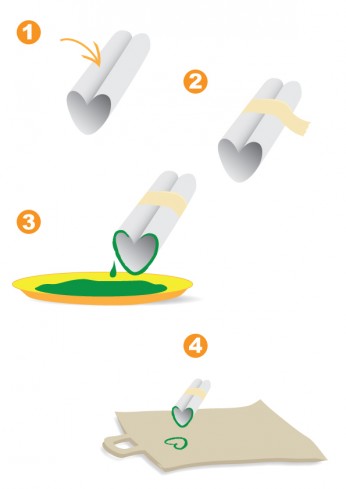 1. Suojaa pöytä sanomalehdillä. Paina vessapaperirullan reunasta pitkittäin taitos sisäänpäin, niin että aukosta tulee sydämen muotoinen.