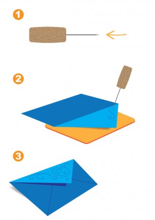 - Pidä kiinni pullonkorkista ja pistele neulalla haluamasi kuvio kirjekuoren läppään. Älä painele reikiä läpän nurjalta puolelta, vaan nimenomaan siltä puolelta, joka näkyy, kun kuori on suljettu.