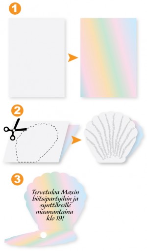 2. Taita paperi keskeltä kahtia ja leikkaa (kaavan avulla) avautuvan simpukan muotoinen kortti. Katso että taitos osuu oikeaan paikkaan. Maalaamasi pinta tulee kortin sisäpuolelle. Koristele simpukan ulkokuori pursottamalla kimalleliimalla simpukan pintaan raitoja. Anna liiman kuivua.