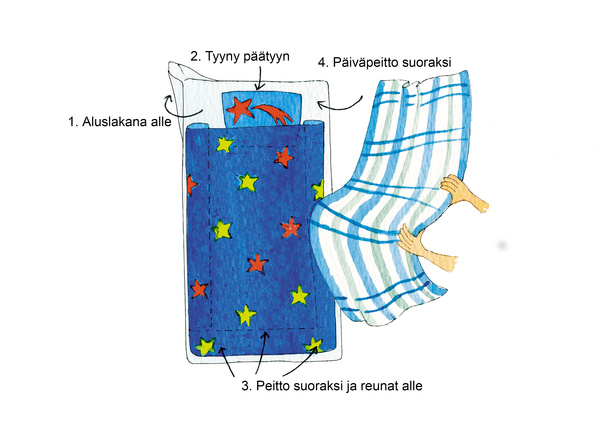 - Nosta peitto ja tyynyt sivuun ja anna vuoteen tuulettua vaikka aamupalan ajan.