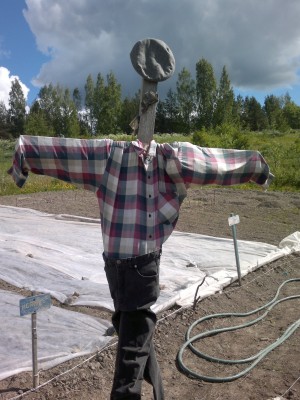 Puutarhakerhon kolmannella viikolla saatiin antaa luovuudelle tilaa, kun puutarhalla touhuttiin linnunpelättimien rakentamisen parissa. Lintuja pelottelemaan syntyi kolme hienoa hahmoa. Pertti Uni-Peipponen hoitaa lintujen pyydystämisen jätesäkkiin erikoisen lintuimurinsa avulla. Sen jälkeen hän grillaa linnuista vartaita, joten tuskinpa kukaan lähialueen linnuista toivoo tämän herran käsittelyyn!