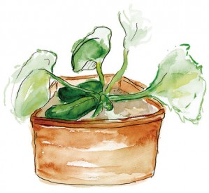 - Istuta kesäkurpitsan taimi keskelle astiaa, jotta juuristolle jää reilusti tilaa levittäytyä.