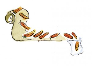 Noston jälkeen porkkana viedään linjastolle, jossa se pestään ja lajitellaan. Lajittelun tarkoitus on, että tuleviin porkkanapusseihin pääsee vain tasalaatuista porkkanaa eikä esimerkiksi vioittuneita porkkanoita.