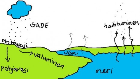 Kun vesi on satanut maahan, se valuu maata pitkin mereen. Tästä syntyvät joet. Osa sataneesta vedestä haihtuu ilmaan ennen kuin vesi ehtii valua mereen. Haihtumisella tarkoitetaan veden muuttumista vesihöyryksi ja siirtymistä ilmakehään. Osa sataneesta vedestä imeytyy maahan pohjavesivarastoon ja osan käyttävät kasvit kasvuunsa.